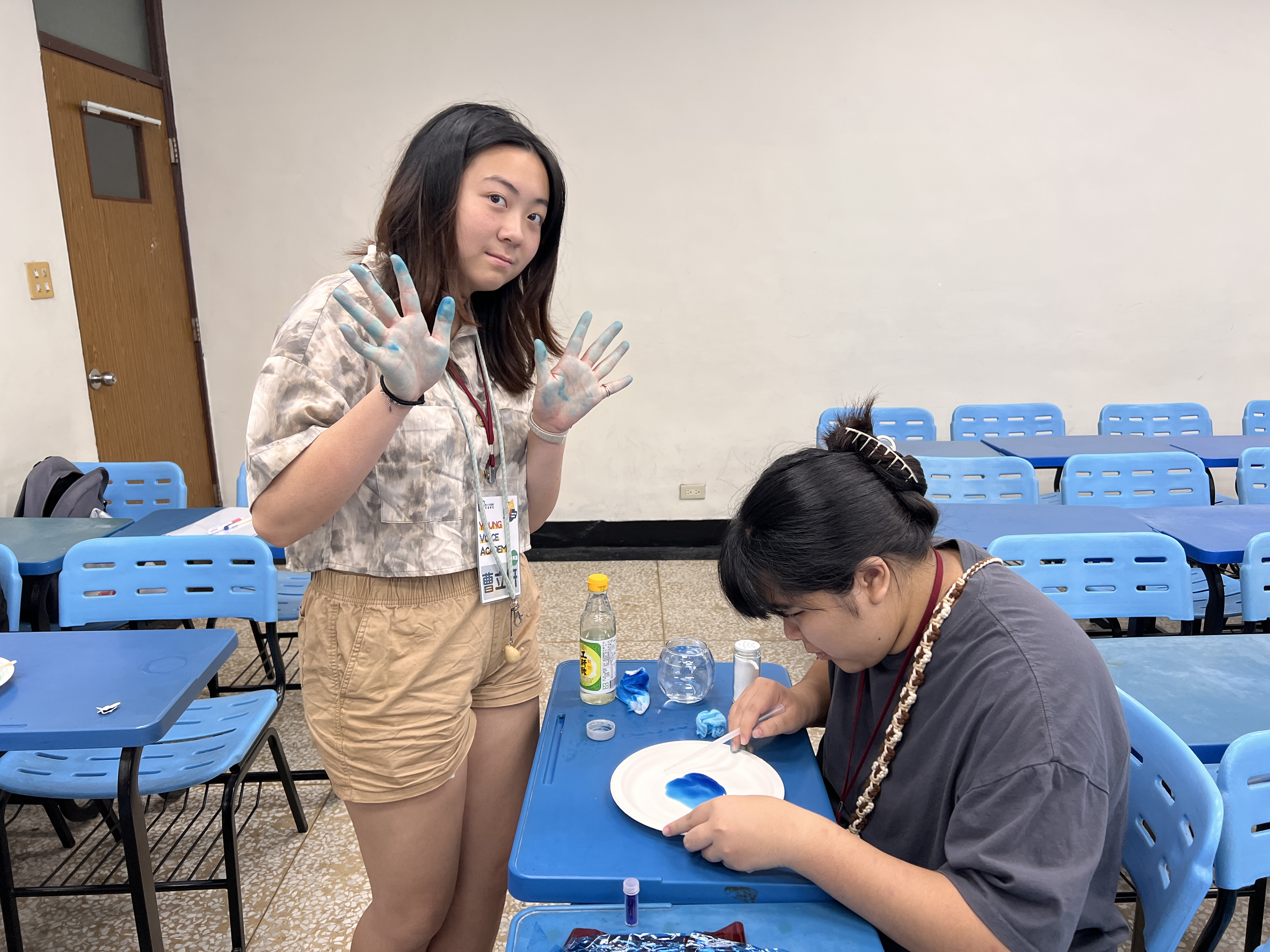 然而這些抽象影像往往仰賴動畫軟體才能完成。貼合高中生當下可執行的操作能力,淨淳導師準備了許多日常器物,包括玻璃瓶、刀叉、顏料、鏡子與手電筒等,以手工方式創造具有抽象視覺感的影像效果。