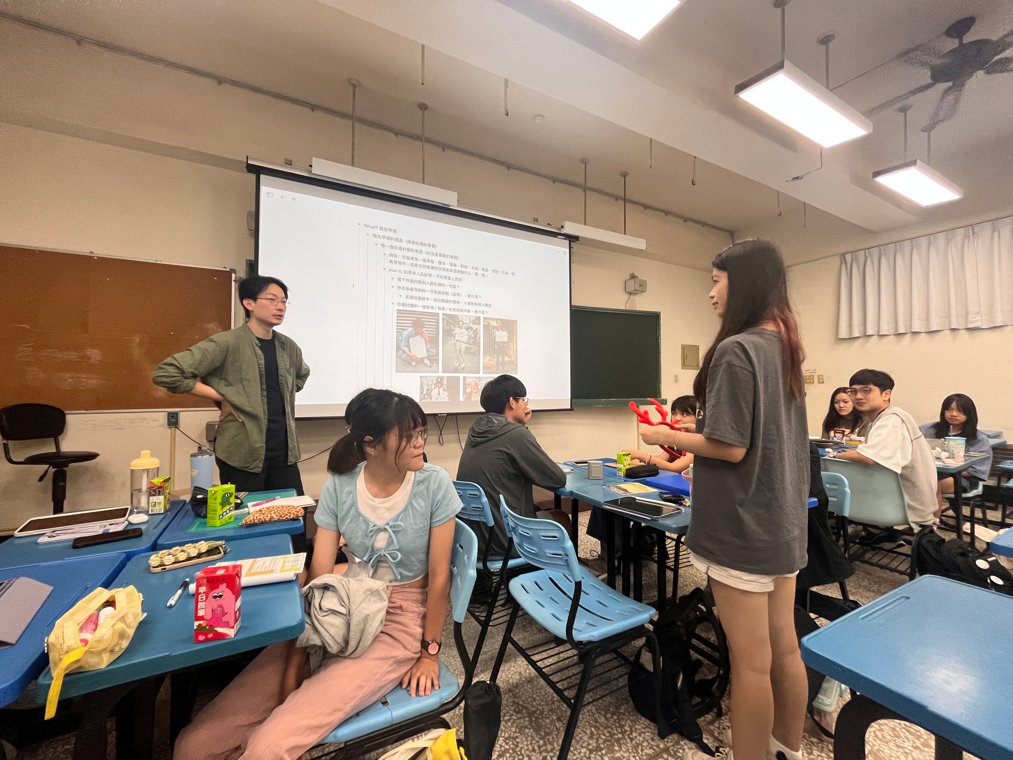 除了拍攝空間,講師也請同學帶來日常物件,如飲料杯、文具或包包等,思考如何以非常規方式在空間中擺放,創造全新的影像效果。有同學在教室擺滿飲料杯,再以後製呈現荒謬氣氛;也有人將刮鬍刀放置於牆角雜草旁,使物件原本的用途在空間中產生出奇妙又幽默的對話。