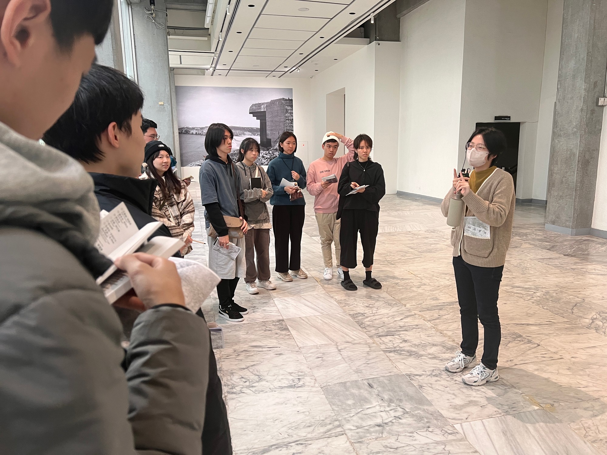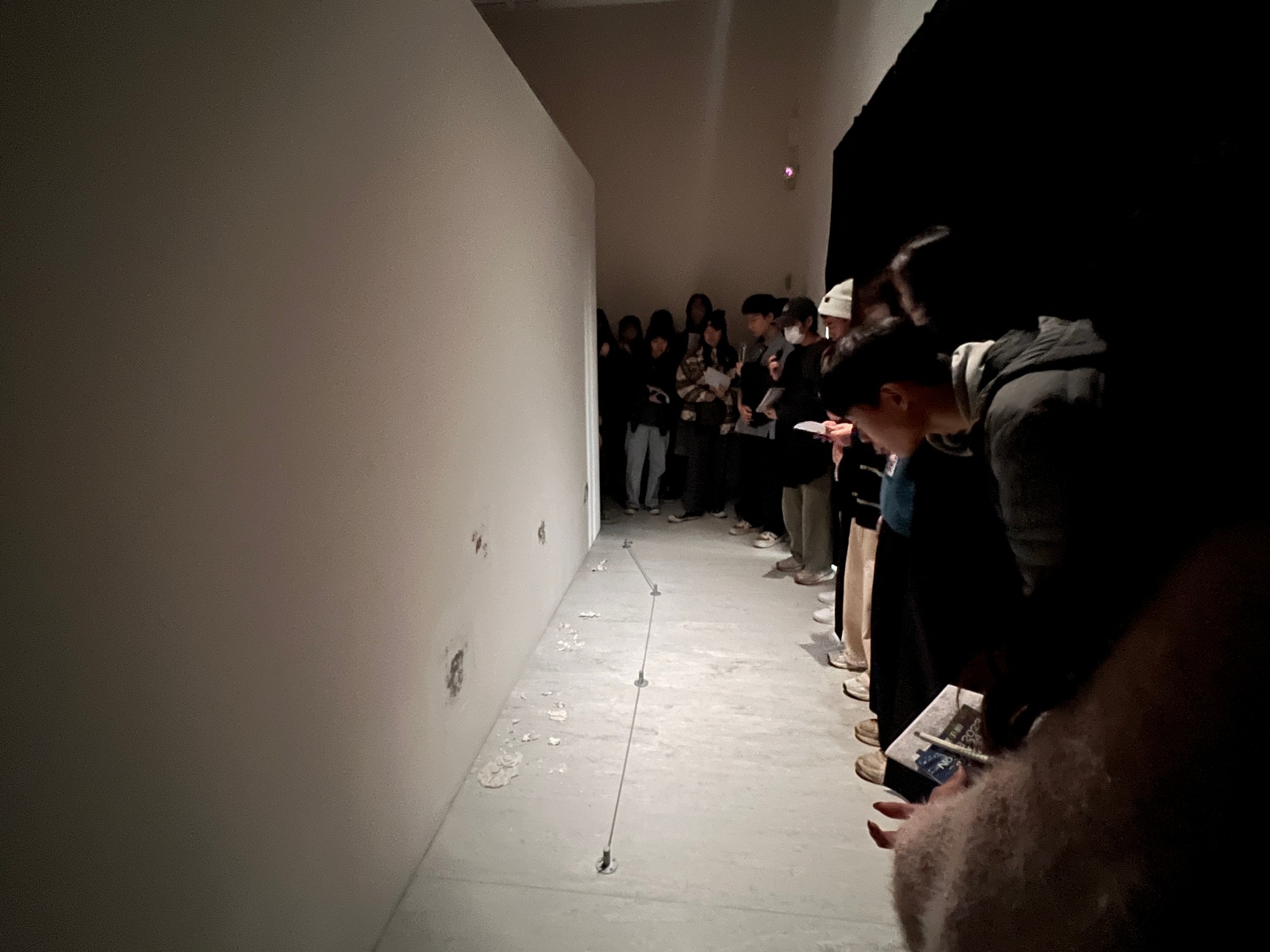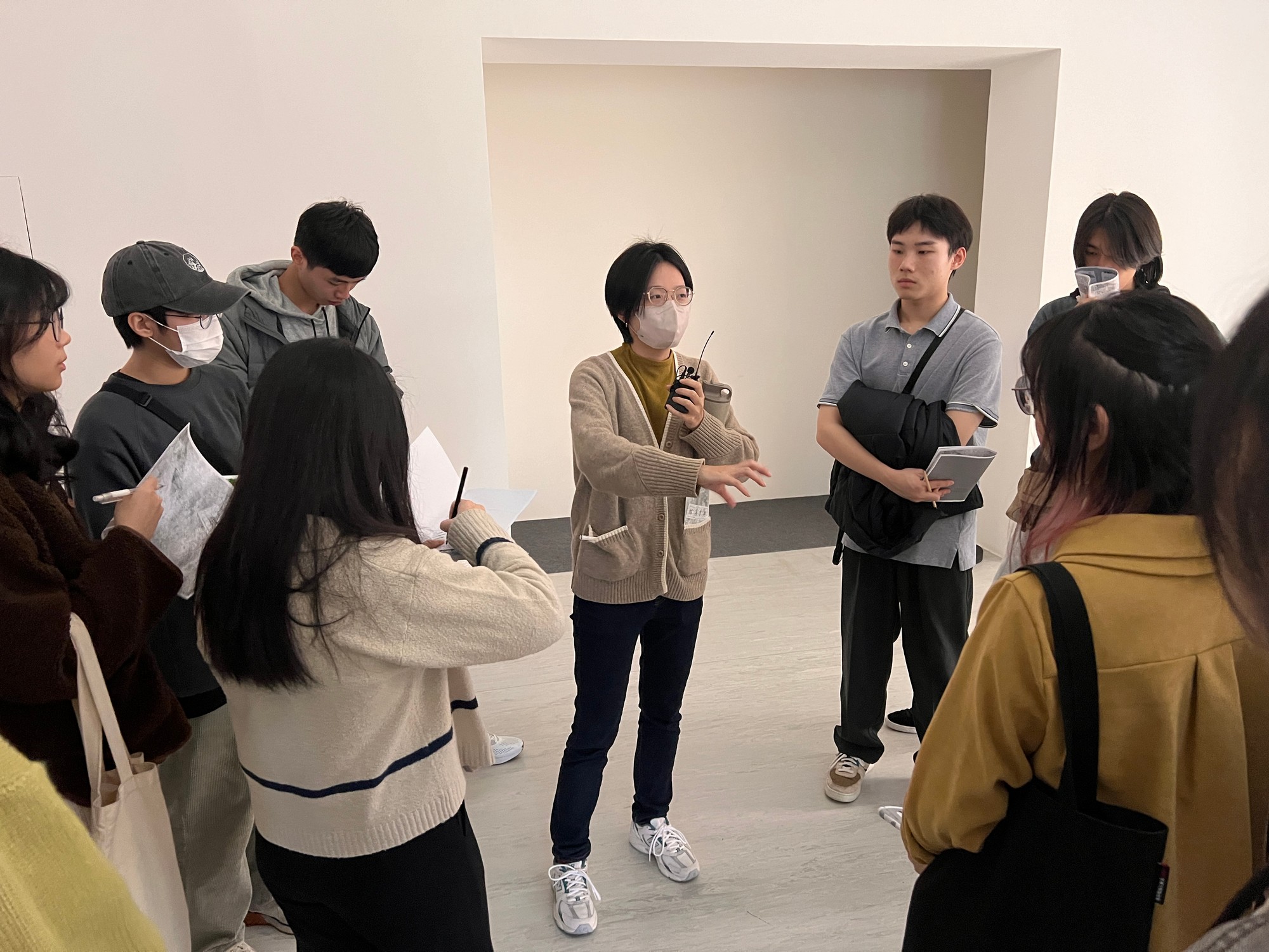 在觀展前,文瑄講師先以簡報導入,將觀展要點分為主題設定、空間佈局、媒材運用等不同面向,並請同學以這些線索反覆觀看展間,思考作品與空間的互動方式。每位同學也需依觀察結果,向他人導覽並分享觀展心得。藉由這樣的練習,觀展不再只是被動瀏覽,而成為主動拆解展覽語言與策展思維的過程。