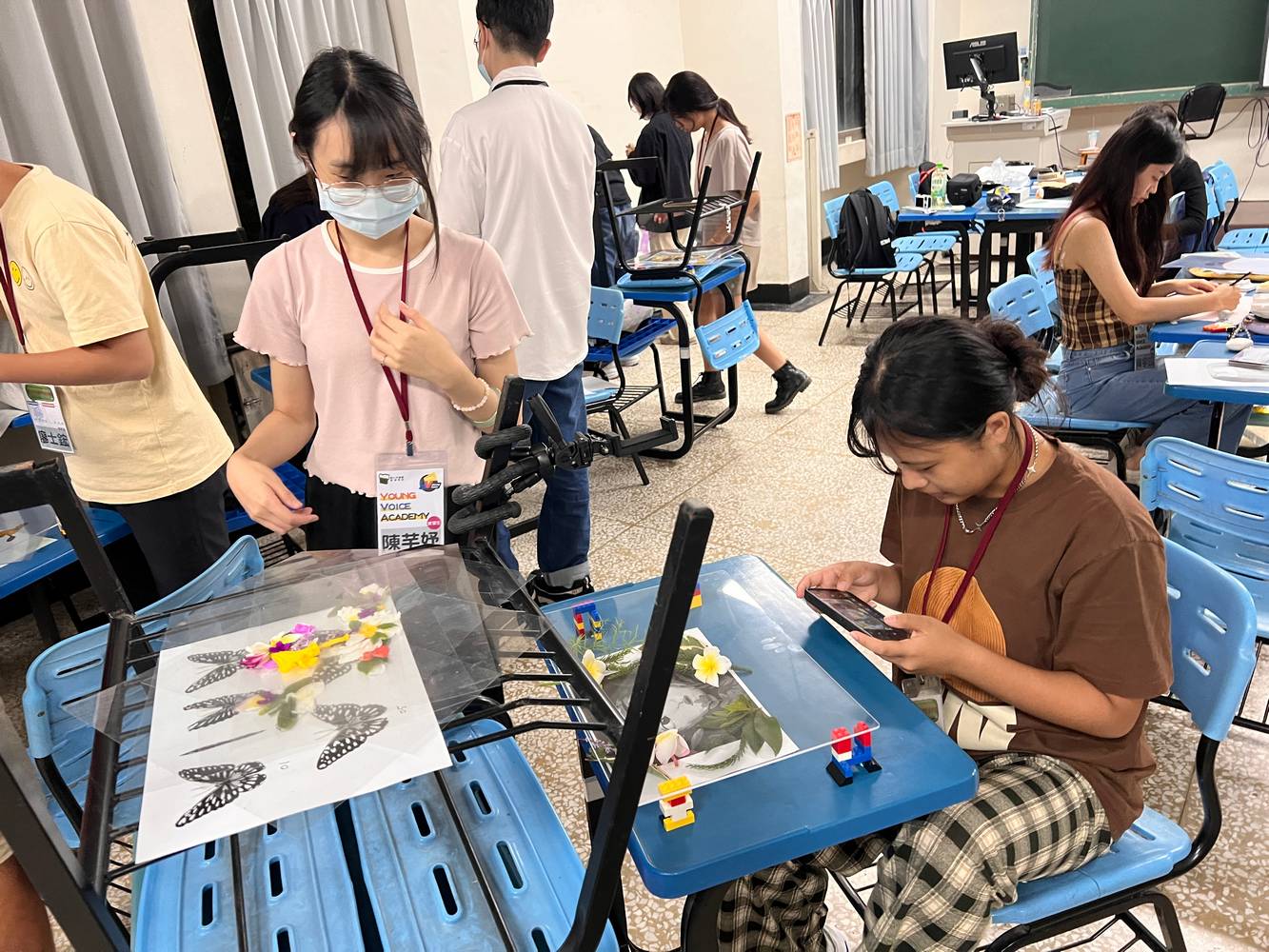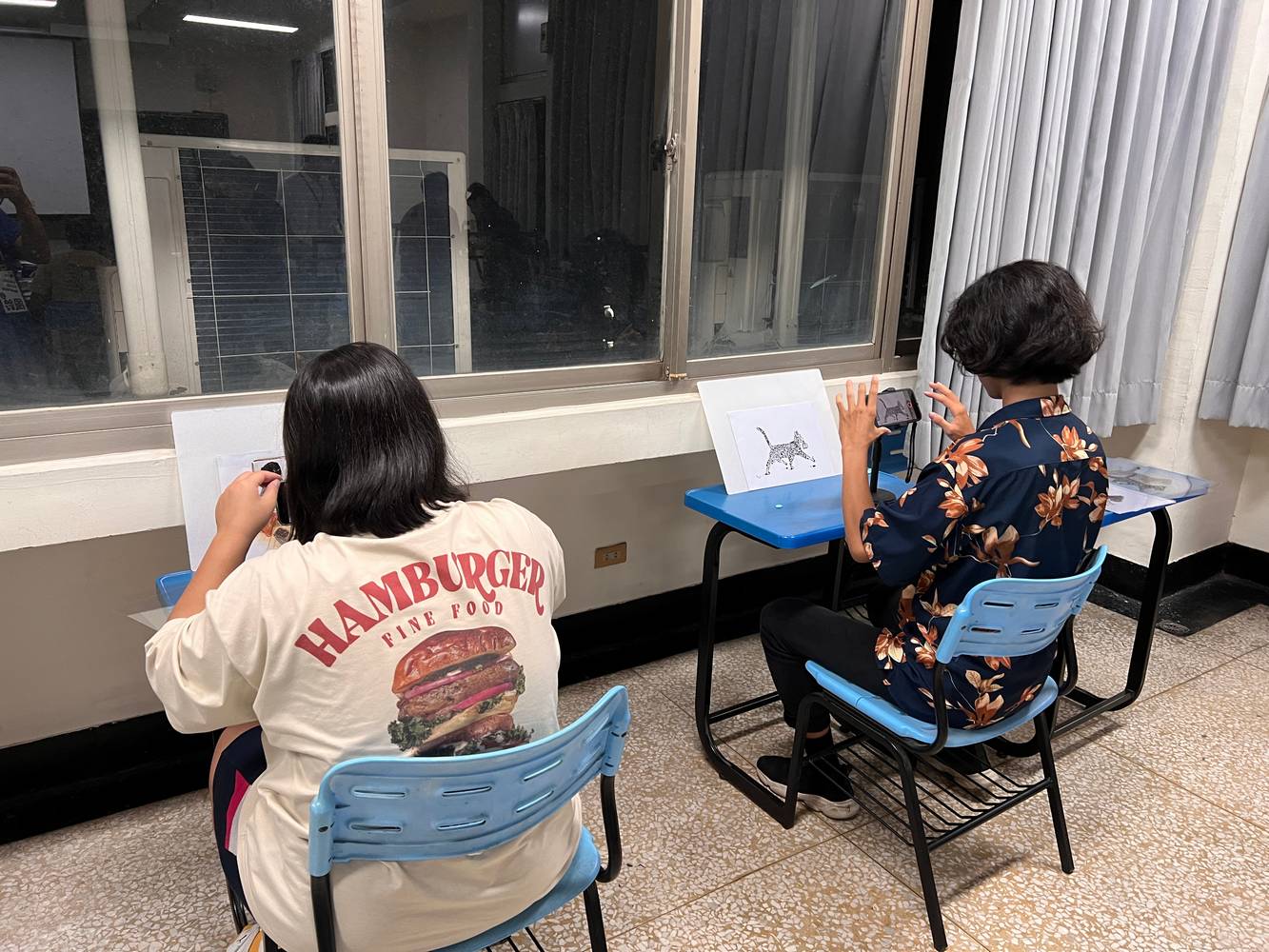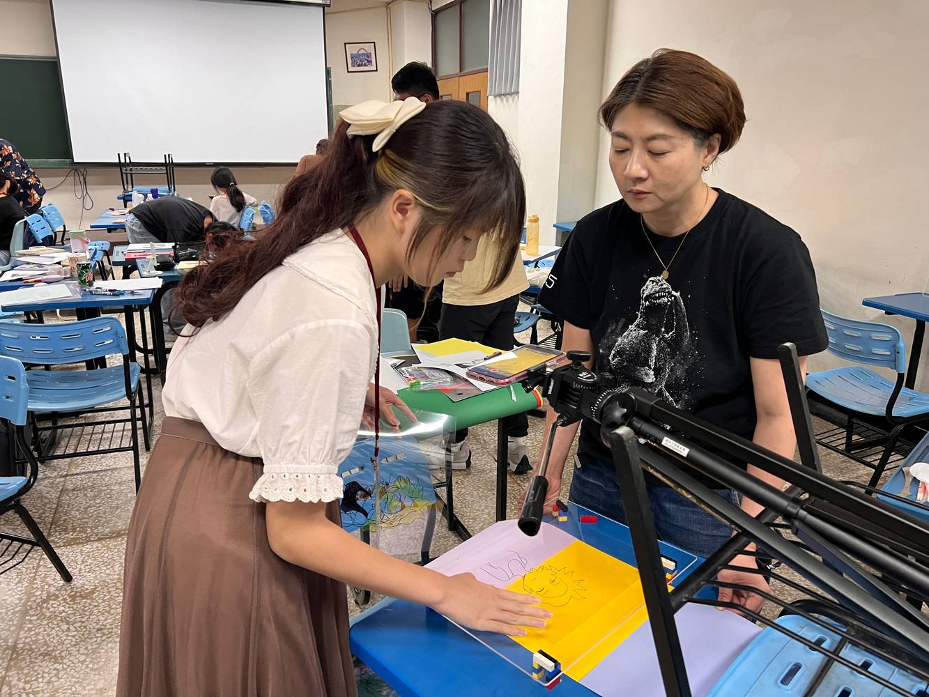 除了介紹概念之外,珮雯導演亦帶領同學進行實際繪製。課堂中選取數段簡短的動畫片段,分為背景與主體兩部分,讓同學自由發揮繪製與設計,並使用手機下載動畫拍攝軟體,將畫面逐格拍攝,最後以程式編輯呈現完整的動態影像。